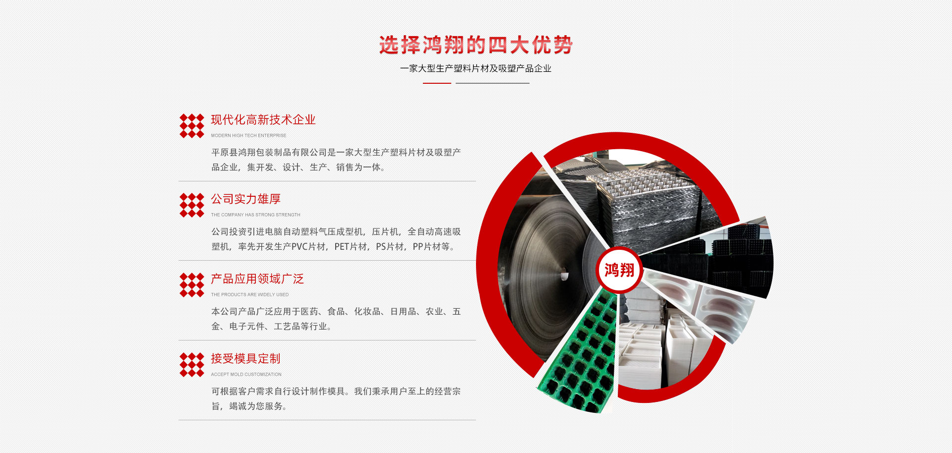 平原縣鴻翔包裝制品有限公司是一家大型生產(chǎn)塑料片材及吸塑產(chǎn)品企業(yè),本公司投資引進(jìn)電腦自動(dòng)塑料氣壓成型機(jī),壓片機(jī),全自動(dòng)高速吸塑機(jī),率先開發(fā)生產(chǎn)PVC片材,PET片材,PS片材,PP片材等,鴻翔是國內(nèi)先進(jìn)的生產(chǎn)廠家之一。本公司產(chǎn)品廣泛應(yīng)用于醫(yī)藥、食品、化妝品、日用品、農(nóng)業(yè)、五金、電子元件、工藝品等行業(yè),也可根據(jù)客戶需求自行設(shè)計(jì)制作模具。本公司技術(shù)力量雄厚,生產(chǎn)設(shè)備工藝先進(jìn)。我們秉承用戶至上的經(jīng)營宗旨,竭誠為您服務(wù)。